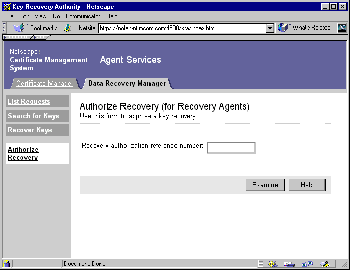 Using the default forms, a Data Recovery Manager agent can search for and recover end users' encryption private keys from the key archive. (Key recovery requires authorization from key recovery agents; see "Key Recovery Process".)