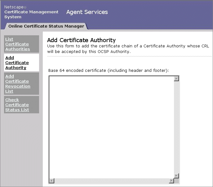The Online Certificate Status Manager Agent Services interface enables a Online Certificate Status Manager agent to interact with the Online Certificate Status Manager (the server). Figure 1-8 shows the Online Certificate Status Manager Agent Services interface.