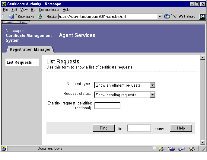 Using the default forms, a Registration Manager agent can list deferred certificate requests from end entities and process them.
