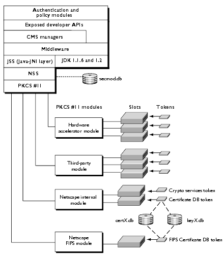 FIPS 140-1 module. This module complies with the FIPS 140-1 government standard for implementations of cryptographic modules. Many products sold to the US government must comply with one or more of the FIPS standards. The FIPS 140-1 module includes a single, built-in FIPS 140-1 Certificate DB token (see Figure 1-10), which handles both cryptographic operations and communication with the certX.db and keyX.db files.The Internal Key Storage token ("Certificate DB token" in Figure 1-10) handles all communication with the certificate and key database files (called certX.db and keyX.db, respectively, where X is a version number) that store certificates and keys.
