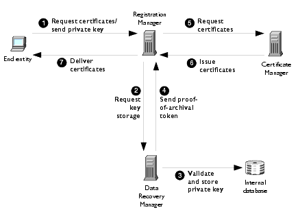 Certificate Management System stores users' encryption private keys in an encrypted key repository. Keys can be retrieved only by authorized key recovery agents. The key repository is encrypted using a Data Recovery Manager's storage private key, which is protected with one or more recovery agents' passwords. Only these designated recovery agents can authorize and initiate a key recovery process.For more information, see "Where the Keys are Stored".