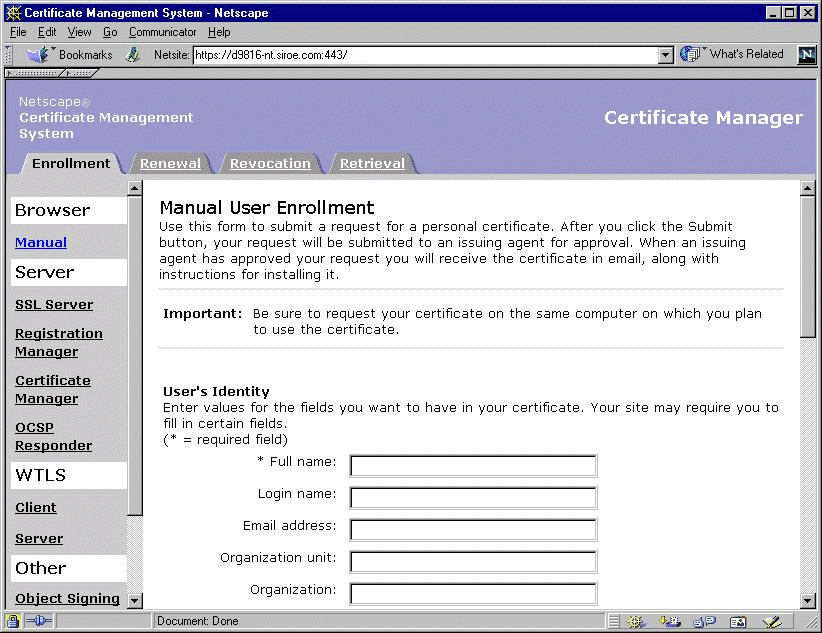 Certificate Management System provides HTML forms for various entitiespeople, routers, servers, and othersthat use certificates to identify themselves and that need to be able to request certificate issuance and management operations. These forms, collectively identified as End-Entity Services Interface, use different protocols and life-cycle management procedures for different kinds of end entities. For example, the Certificate Manager provides separate certificate enrollment forms for clients such as Netscape Navigator 3.x, versions of Netscape Communicator later than 4.5, and Microsoft Internet Explorer. The reason for this is that end entities running Navigator 3.x and Communicator versions earlier than 4.5 present an enrollment form based on the use of the HTML tag KEYGEN to generate keys; end entities running Internet Explorer present a form based on PKCS #10, the RSA standard for certificate request syntax.For a summary of the various end entities, protocols, cryptographic algorithms, and key pairs (single or dual) supported by Certificate Management System, see "End Entities and Life-Cycle Management".