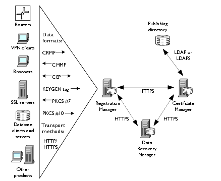 Supports multiple message formats, such as KEYGEN/SPAC, CRMF/CMMF, CRS/CEP/SCEP, and PKCS #10 and CMC for certificate requests. All requests are delivered to Certificate Management System over HTTP or HTTPS; in the case of CRS/CEP/SCEP protocol, the delivery method is always over HTTP. For a description of the acronyms, see "Standards Summary".