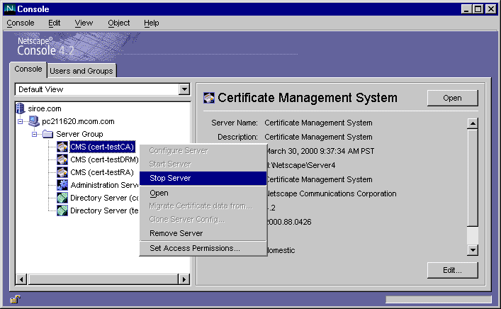 You can use Netscape Console to stop an instance of Certificate Management System running on a local or remote host.To stop Certificate Management System from Netscape Console: