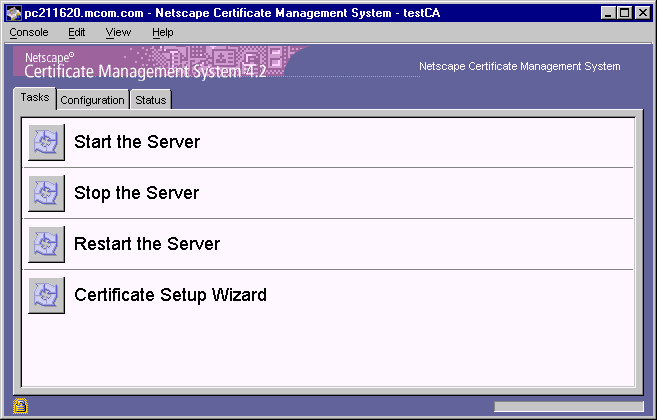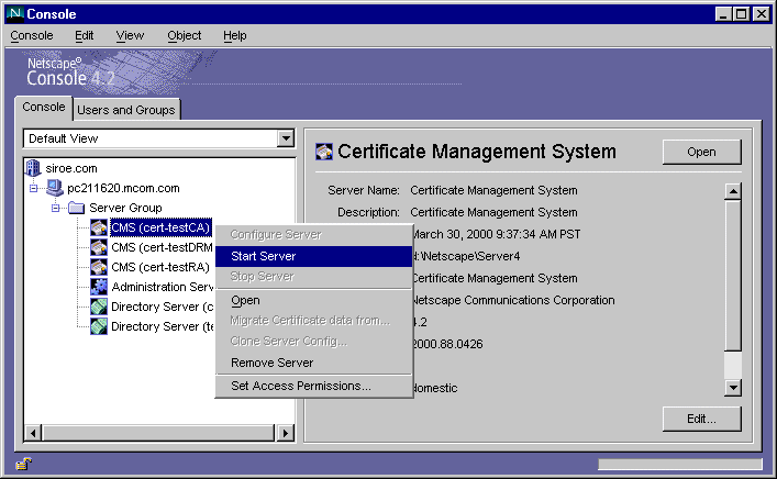 You can use Netscape Console to start an instance of Certificate Management System running on a local or remote host.To start Certificate Management System from Netscape Console: