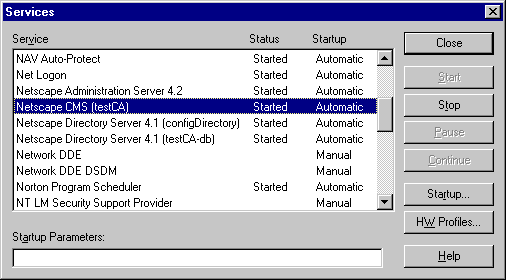 If you have installed Certificate Management System on a Windows NT system, you can start the server (as a service) from the Windows NT Services panel (see Figure 8-1). The CMS service has the following name:
