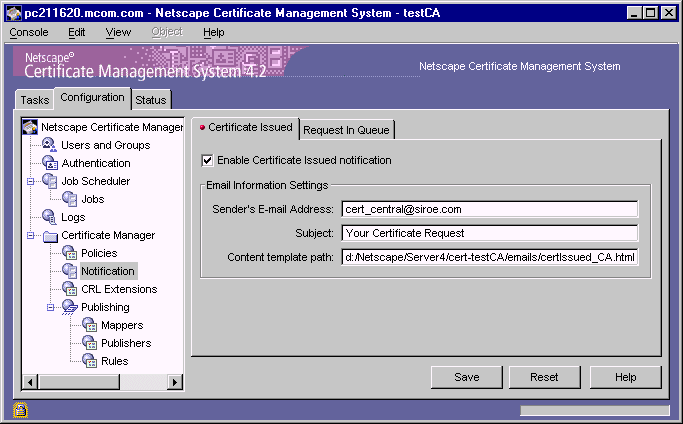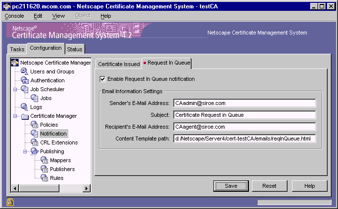 In the navigation tree of CMS window, select the subsystem, and then click Notification. (The figure below shows the Certificate Manager's notification feature; the Registration Manager also has a similar feature.)