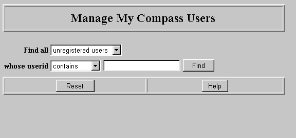 The Manage My Compass Users window (as shown in Figure 7.3) allows administrators to perform searches for users (user IDs, registered, unregistered, and invalid) so they can manage My Compass user registrations.