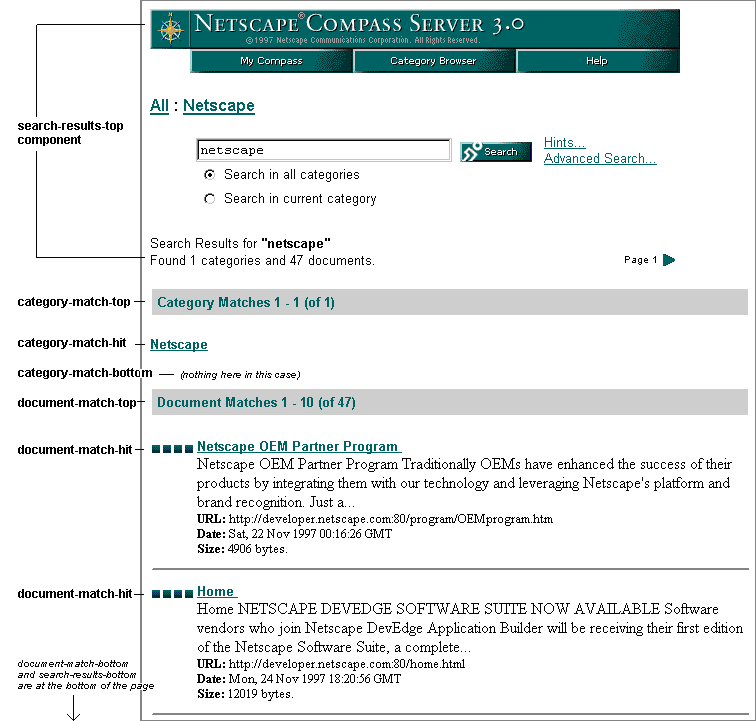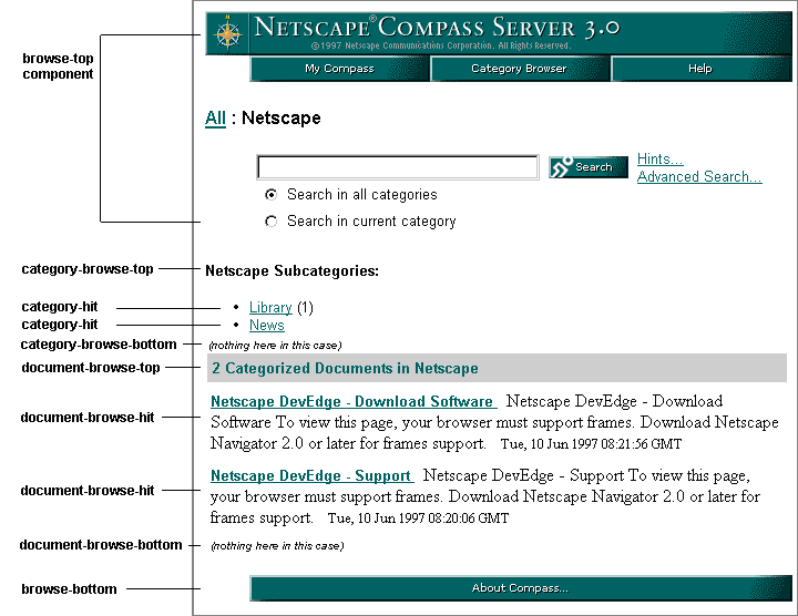 The Compass Server End User page has two basic modes of appearance: browse mode and search-results mode.
