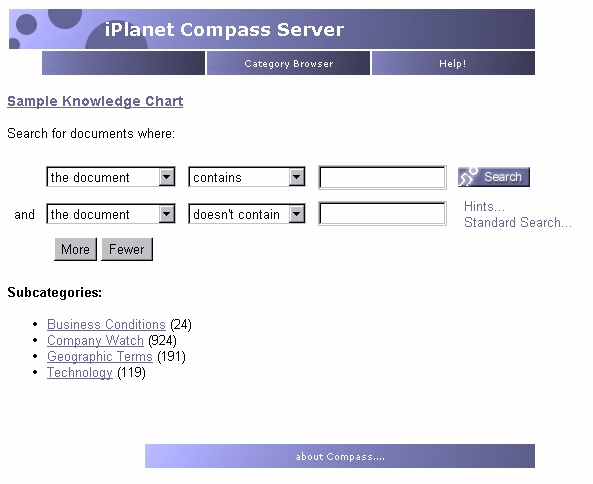 The iPlanet Compass Server provides all the features that users expect of an index. These features are specifically designed for the task of locating resources on a computer network, and as the administrator you can further customize the user interface. But the key is that Compass Server provides the tools users expect when looking for a particular item.