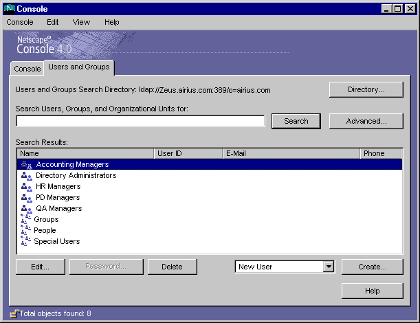 Netscape Console provides you access to a consolidated, networkwide repository for application data about user accounts, group lists, access privileges, and other security information. Use Netscape Console to create or locate and manage records for users and groups on any node in your enterprise.