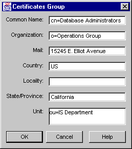 Organization. Enter the name of the organization the group belongs to. Example: o=Operations Group