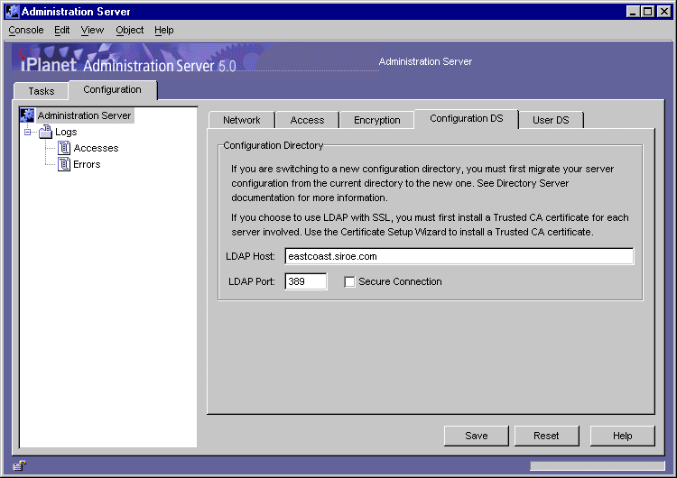 In the iPlanet Console navigation tree, select the instance of Administration Server that you want to change configuration Directory Server settings for.