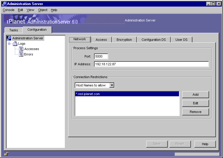 - Connection Restrictions. Displays a list of hosts allowed to connect to this instance of Administration Server. Use the drop-down list to specify whether you're adding to the list by DNS name or by IP address. The list is evaluated first by host names, and then by IP addresses.
