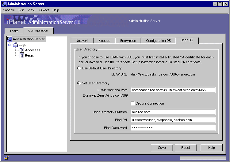 - Secure Connection. Check this box if you want to connect securely with the configuration Directory Server. Before choosing this option, make sure the configuration Directory Server running on the specified LDAP Host and LDAP Port already has SSL activated on it.