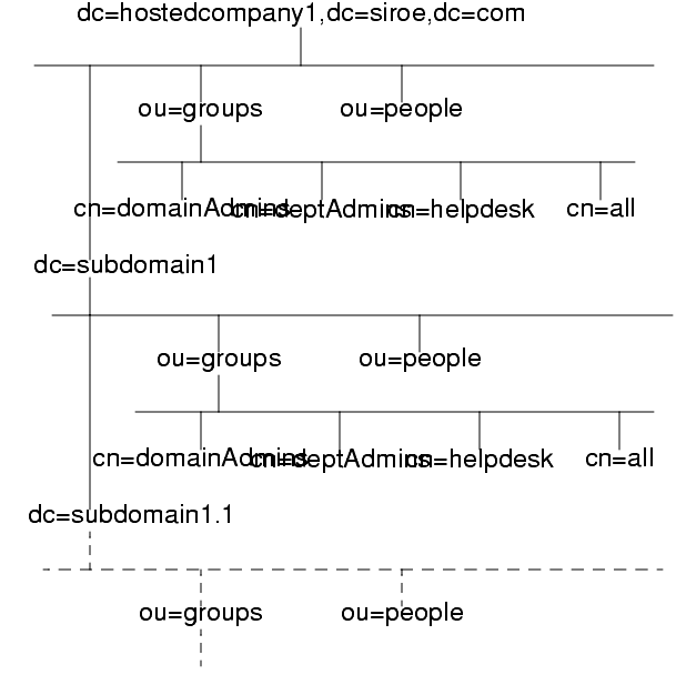 However, at the same time, members of cn=DomainAdmins,ou=Groups, dc=subdomain1.1, would be denied access to the ou=people,dc=hostedCompany1 and ou=people,dc=hostedCompany1 nodes.