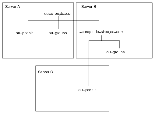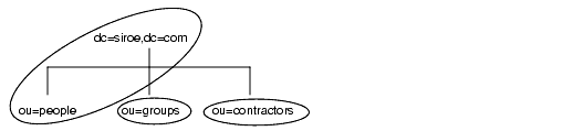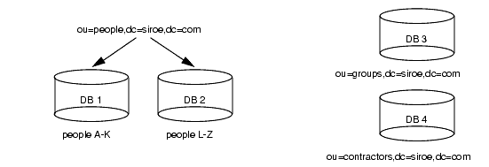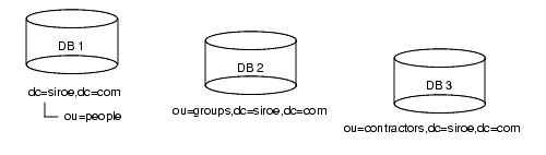 The ou=people suffix and all the entries and nodes below it might be stored in one database, the ou=groups suffix on another database, and the ou=contractors suffix on yet another database.