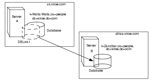 dc=siroe,dc=com")(version 3.0; acl "Client authorization for database links"; allow (all) userdn = "ldap:///uid=*,c=us,ou=people,dc=siroe,dc=com";)This ACI allows clients that have a uid in c=us,ou=people,dc=siroe,dc=com on server one to perform any type of operation on the l=Zanzibar,c=africa,ou=people,dc=siroe,dc=com suffix tree on server three. Should you have users on server two under a different suffix that will require additional rights on server three, you may need to add additional client ACIs on server two.