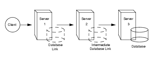 add a local client ACI that allows the client operation to succeed on server two, so that it can be forwarded to server three. This local ACI is needed because you have turned local ACI checking on for the DBLink2 database link.
