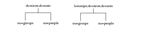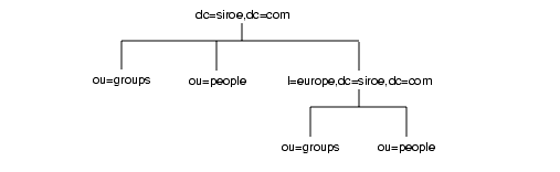 Searches performed by client applications on the dc=siroe,dc=com branch of siroe.com Corporation's directory will not return entries from the l=europe,dc=siroe,dc=com branch of the directory, as it is a separate root suffix.