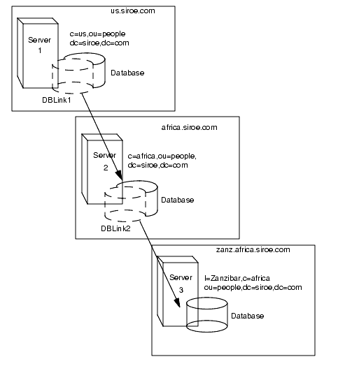 Once you have completed all these steps your cascading chaining configuration is set up. This cascading configuration will allow you to bind to server one and modify information in the l=Zanzibar,c=africa,ou=people,dc=siroe,dc=com branch on server three. Depending on your security needs you may or may not want to provide more detailed access control.