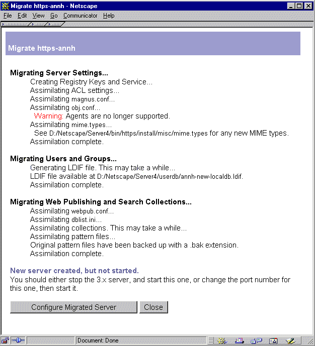 Note. If you are migrating an SSL-enabled server, you will have to manually start the migrated server because you have to specify a password when starting it.