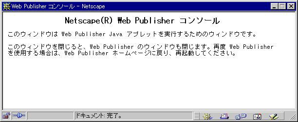 Web Publisher は、Web サーバ パブリッシングをクライアントが簡単に利用できるようにするための Java アプレットです。iPlanet Web Server では、ホームページ付き Web Publisher アプレットがデフォルトでインストールされます。