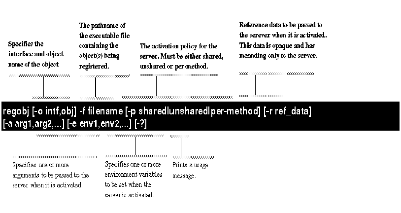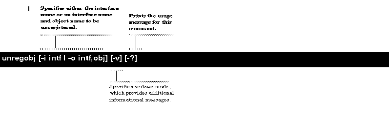 This command unregisters one or more ORB objects with the Object Activation Daemon. Once an object is unregistered, it can no longer be activated automatically by the OAD when a client requests the object. ORB objects being unregistered must have been previously registered using the regobj command, described on page 1-12 in this guide. If you specify only an interface name, all ORB objects with that interface that are registered with the OAD will be unregistered. Alternatively, you can specifically identify an ORB object by its interface name and object name.NOTE: If an object implementation is started manually as a persistent server, it does not need to be registered with the OAD.Example: