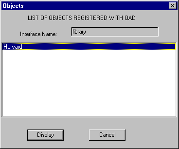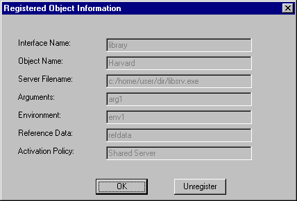 If you want to view information about this object or unregister it, click Display. The following sample of the screen appears: