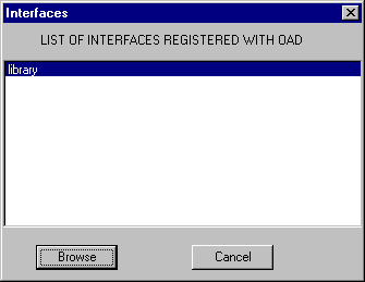 In Windows 95 or Windows NT, you list registered objects by launching the ORBeline Registry icon first and then selecting List in the menu bar. The following screen appears:This window lists the interfaces that are registered with the object activation daemon on your computer. By selecting one of the interfaces and clicking on Browse, you can view the object(s) implementing that interface that are also registered with the activation daemon. The following screen appears: