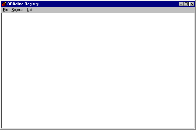 In Windows 95 or Windows NT, you start the object registration command by typing regobj at the command line or launching the ORBeline Registry icon. The following screen appears:You can register an object by selecting Register from the menu bar. The following sample of the screen appears:
