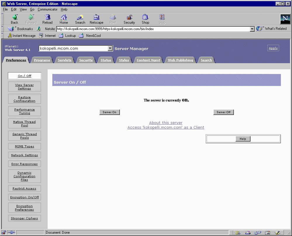 If you have other 4.x iPlanet Web Servers, you can manage them through the Netscape Console, a client-based Java application. For more information, see Netscape Console or Managing Servers with Netscape Console.