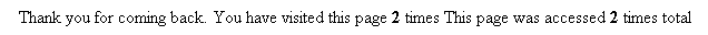 The following example code defines a servlet that counts visits to a web page. This is the CounterServlet example in the server_root/plugins/samples/servlets/servlets/Counter directory.This servlet generates an HTML page that reports the number of visits for an individual user and for all users, as shown in Figure 2-2.
