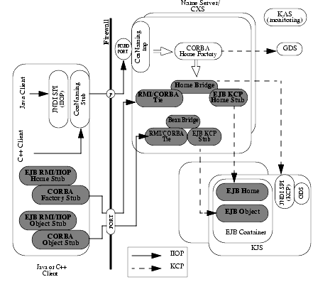 iAS supports Rich Clients using a Java engine called the CORBA Executive Server (CXS). The CXS acts as a bridge between Rich Clients that use the Internet Inter-ORB Protocol (IIOP) and the EJBs on iAS' Java engine(s). For every EJB on iAS, the CXS instantiates two objects, one each for the EJB home and remote interfaces, that act as bridges between IIOP and iAS' internal communication protocol.The following diagram illustrates the various components of the Rich Client architecture.