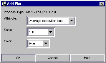 Once an attribute data plot is specified for a process (KCS, KJS, and KXS), you can adjust the plot using the Attribute, Color, and Scale drop-down boxes.To change the way a process attribute is plotted, perform the following steps: