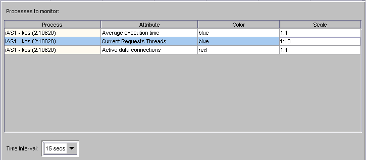 For each process, you can chart one or more attributes. You can also simultaneously chart the attributes of several application servers, if you have a multiple-server enterprise.
