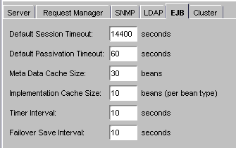 Failover Save Interval: how frequently (in seconds) the EJB state is saved. If the server fails, the last saved state of the EJB can be restored. Data saved is available to all engines in a cluster. This value is set on a per server basis and applies to EJBs that were deployed with Failover option enabled (on the General tab of the Deployment Tool EJB descriptor editor).