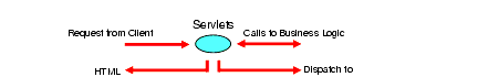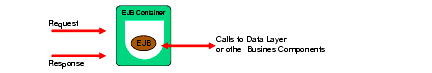 In the graphic above, the servlet receives the request, validates input, calls the session bean and calls the JSP. The JSP formats the HTML and responds to the client. The session bean validates the request, executes the process, and enforces transactions. The entity beans manage the data.