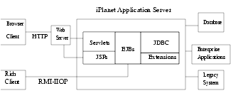 The Rich Client is a stand-alone Java program that can directly access EJBs deployed on iPlanet Application Server. Traditionally, clients communicated with iPlanet Application Server through the web-path, i.e. by speaking HTTP to server components such as JSPs and Servlets which in turn had access to EJBs within the context of the server. The J2EE v1.2 specification, however, requires that stand-alone clients be able to talk to iPlanet Application Server using the RMI-IIOP standard. Chapter 9 of the J2EE v1.2 specification also requires that these stand-alone clients operate within the context of an Application Client Container (ACC) that isolates server-specific issues, leaving the clients completely portable. Through its Rich Client infrastructure, iPlanet Application Server allows Java clients to directly access EJBs on iPlanet Application Server. These clients could operate within an ACC that ships with iPlanet Application Server as required by the J2EE ACC specification or more straight forward direct access (non ACC path) the way Java programmers are used to writing them.The diagram below is a schematic representation of the iPlanet Application Server architecture and illustrates the difference between the Rich Client and web paths. While browser clients communicate with iPlanet Application Server using HTTP through a Web Server, Rich Clients circumvent the Web server and directly access EJBs as RMI-IIOP clients. Failover support is also provided for entity bean failover in case of a Corba Executive Service (CXS) crash