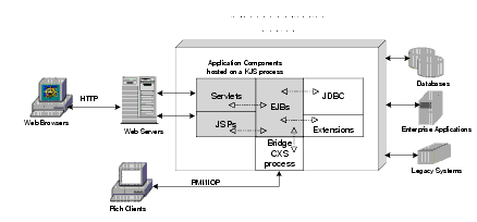 You must add a CXS (Bridge) process if Rich Clients are to communicate directly with EJBs hosted on a KJS process via the Internet Inter-ORB Protocol (IIOP). Typically, requests are made through via a web path where requests originate at a Web Browser and then are processed by JSPs and servlets which in turn access EJBs. This web path uses the HTTP protocol. In the case of Rich Clients, requests are made through a Java program directly to EJBs using the CORBA Executive Server (CXS), a Java engine within iAS which acts as a bridge between Rich Clients and EJBs. For more information about Rich Clients see the Programmer's Guide.