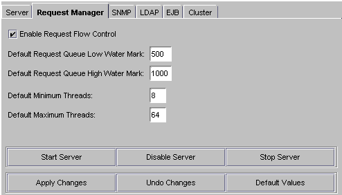 The web connector plug-in routes users requests to applications residing on iPlanet Application Server to the Executive process (KXS). These requests are logged to the request queue in the Executive process. You can control the maximum number of threads the web connector plug-in will use. This prevents the request queue from receiving more requests than it can process. To control the flow of requests, you can set the maximum number of requests that are logged to the request queue. The maximum number is called the "high watermark." When the request queue reaches this number no new requests will be accept and the web-server will return an error page for additional iAS requests. You can also set the number of requests in the queue in which logging will resume. This number is called the "low watermark."To control the flow of requests on the server level, perform the following steps: