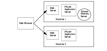In this example, the Web servers are on the same machine as the iPlanet Application Servers. If the Web servers were housed on a separate tier of machines, then you would enter the same global configuration name and cluster name during the Web connector installation.