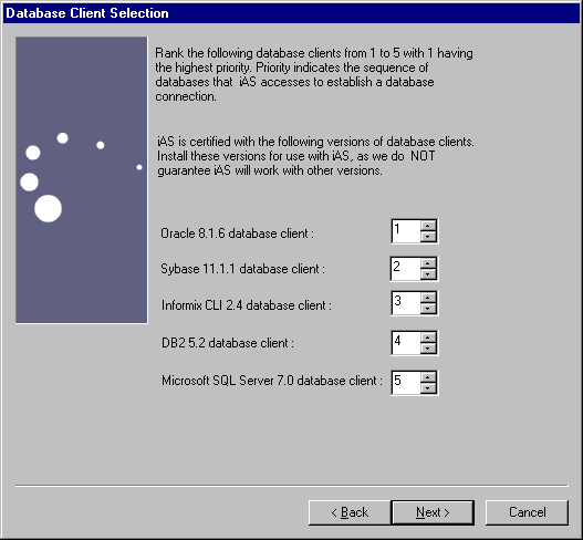 The installation program lists all supported database clients. The clients are allow your applications to connect to your database back ends. Rank the clients according to connection priority, whether you've installed them yet or not. Client software can be added after installation. Sample applications are configured for the highest priority database.