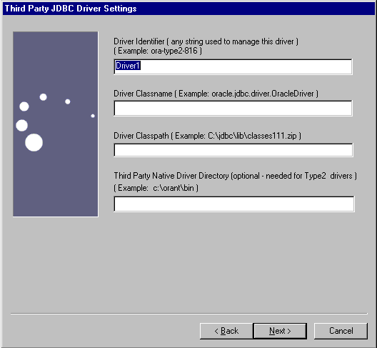 For each third party JDBC driver, enter the driver's identifier, classname, and classpath; formatting each entry as shown in the wizard's examples.