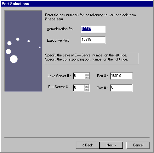 Enter the port numbers for the Administrative Server (KAS), the Executive Server (KXS), the Java Servers (KJS), and C++ Servers (KCS).
