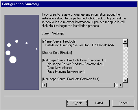 Scroll down the Current Settings list to verify your settings. Click Back to return to a previous panel to make corrections, otherwise click Install.