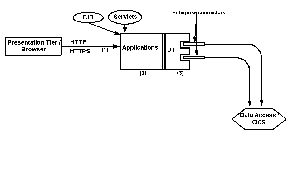 The application server tier (2) houses the intelligence for the web server, applications, and communications to databases such as Oracle, DB2. Enterprise Java Beans (EJB) and servlets are supported by the iPlanet Application Server. In addition, iAB and iEB Tools provide ways to create EJB's and servlets, which are accessed by the UIF (Unified Integration Framework), as seen in the Data Access Tier.