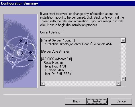 The iPlanet Application Server must be installed first. For more information, please see the iPlanet Application Server, Version 6.0, Installation Guide.Installation of the iPlanet Application Server Enterprise Connector for CICS adapter