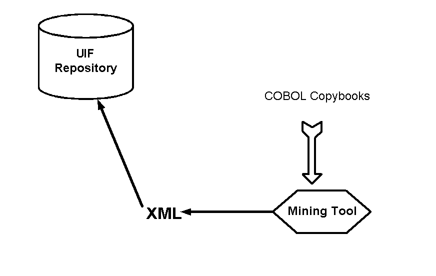 The Mining Tool uses a common cross-platform format, XML, to populate the repository by taking backend information such as COBOL COPYBOOKS, and converting it to XML. The XML is then stored in the UIF Repository in a specific structure that can be recalled when necessary.