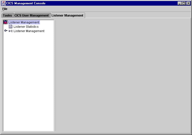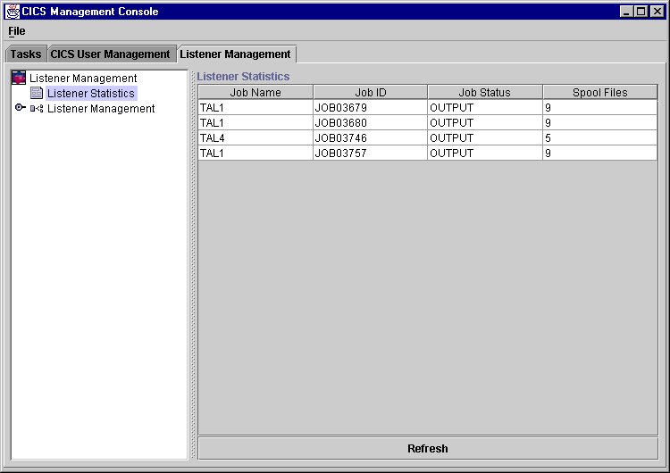 From the CICS Management Console, you can manage listener jobs. A listener job is similar to the Relay. A listener listens to incoming TCP/IP conversations and relays them to a CICS region. The Listener Statistics option enables you to start, view, and manage listeners on the MVS. You can define new Listeners and submit them, cancel, and restart Listener jobs. This option also displays listener statistics information, such as name, ID, job status, and spool file.Upon selecting the Listener Statistics option and logging on to the mainframe, the following window appears: